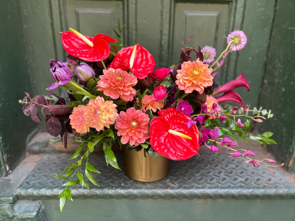 Bright reds, bold pinks, and pops of green and purple make this garden-style arrangement playful, fresh, and full of personality. Dahlia-forward and fabulously eye-catching–and just in time for summer.