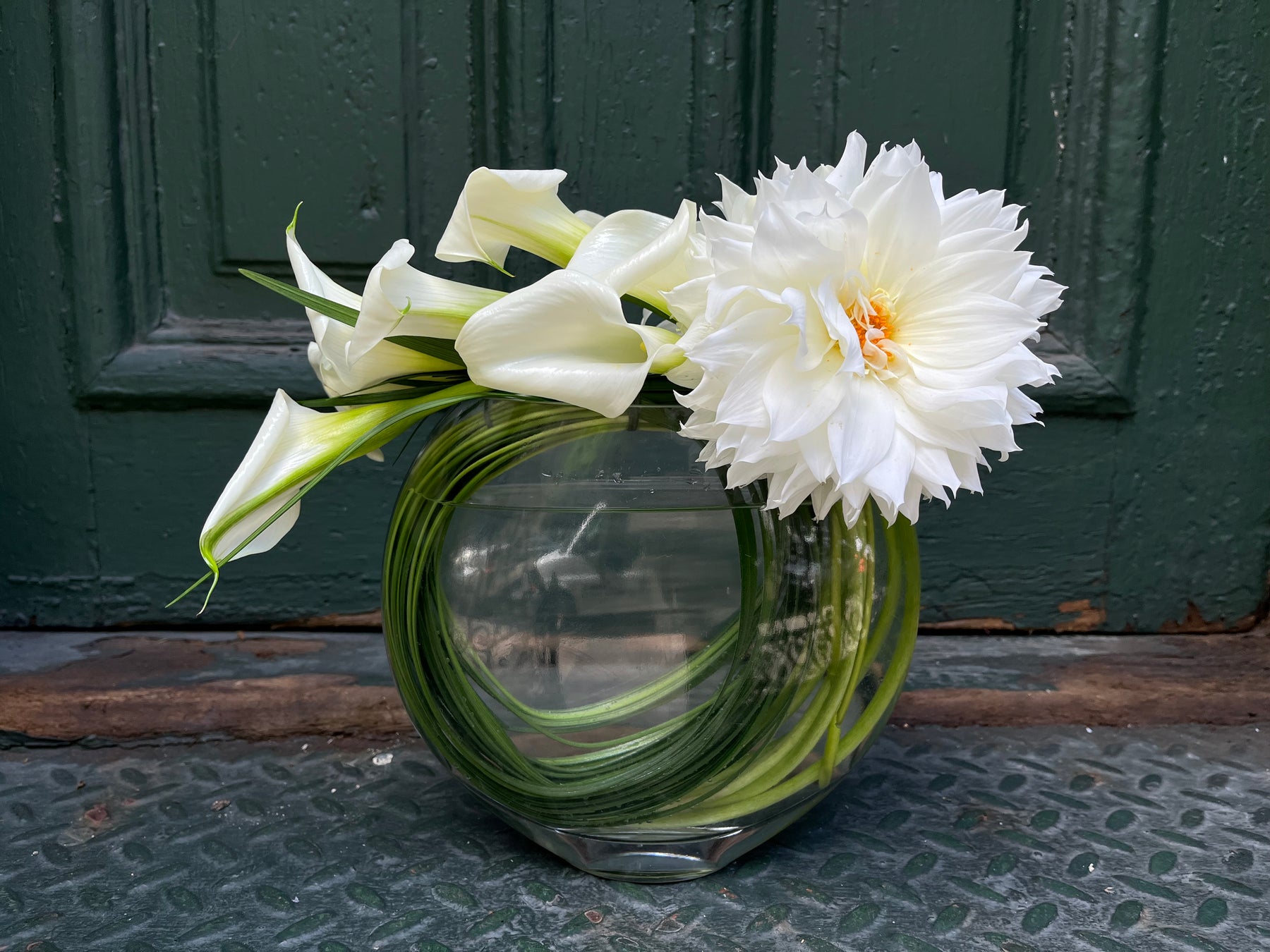 Calla Lilies designed in a modern vase with a Dahlia accent and lily grass.