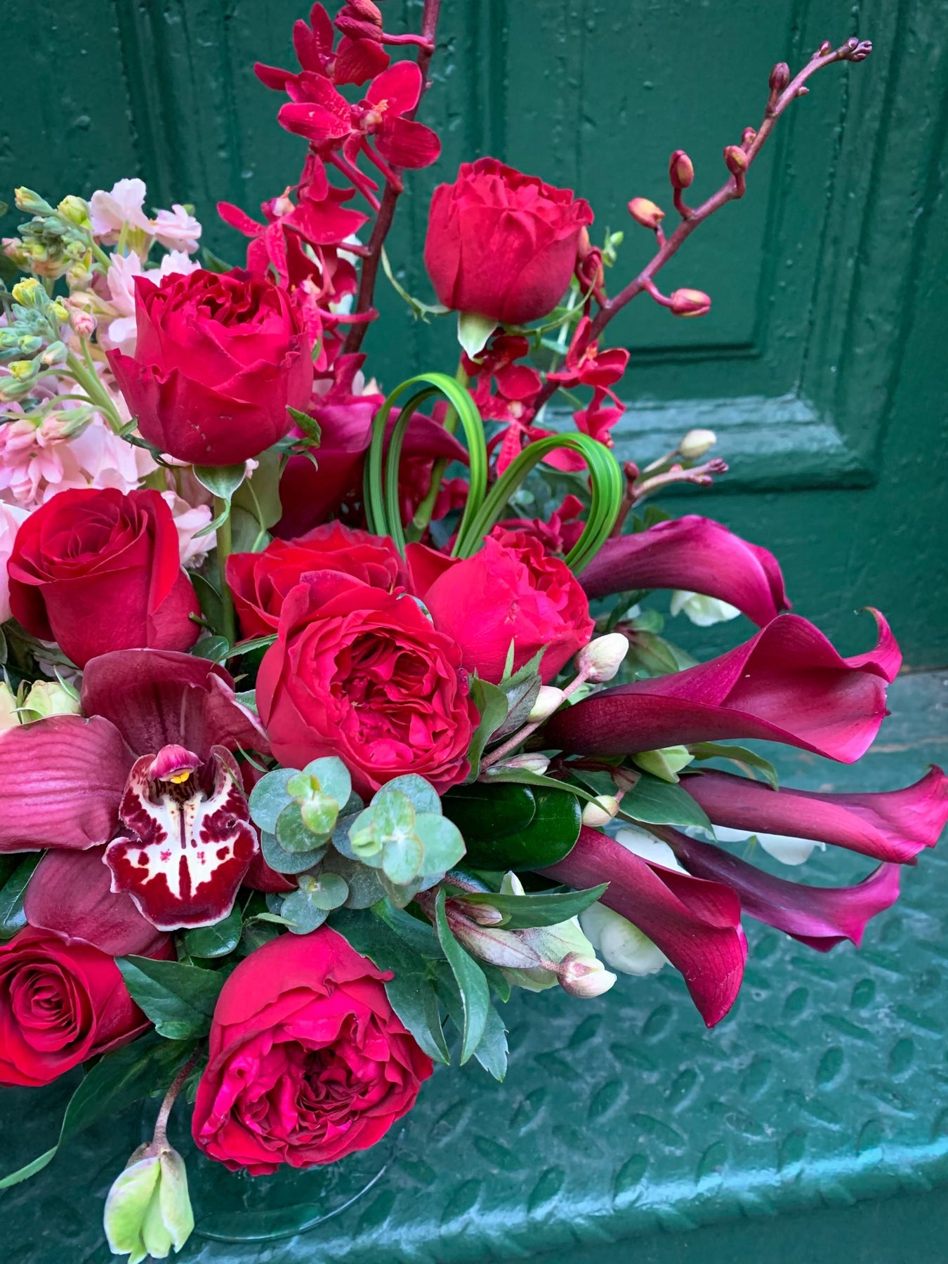 The garden roses, the spray roses, red James Story Orchids, Cranberry Calla, Hints of Tulips, Pink Fragrant stock flower, mixed eucalyptus and greenery. An absolute stunner for anyone that loves garden style design.