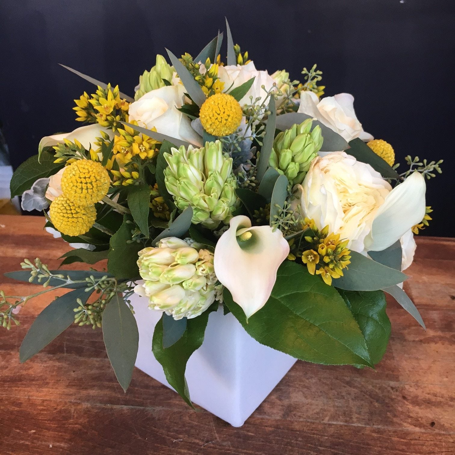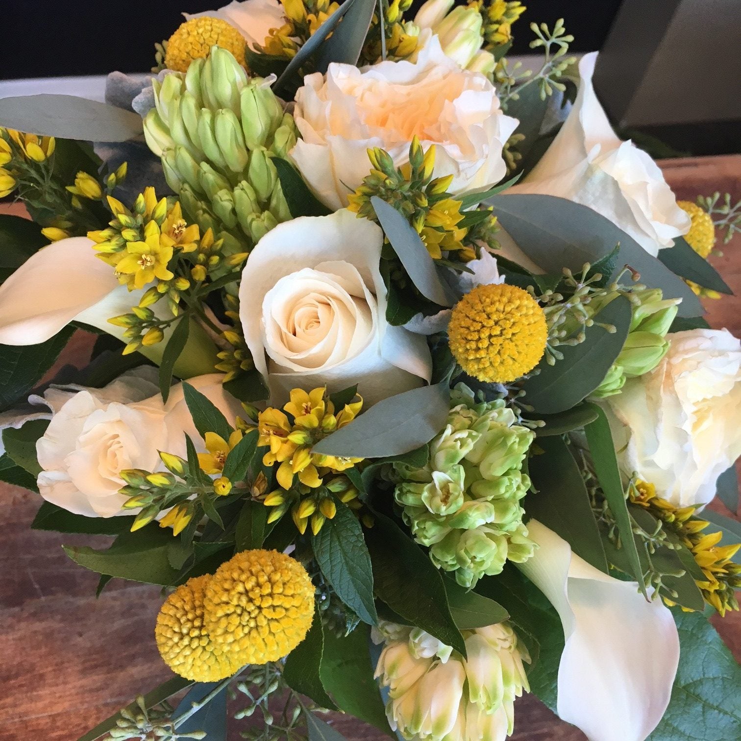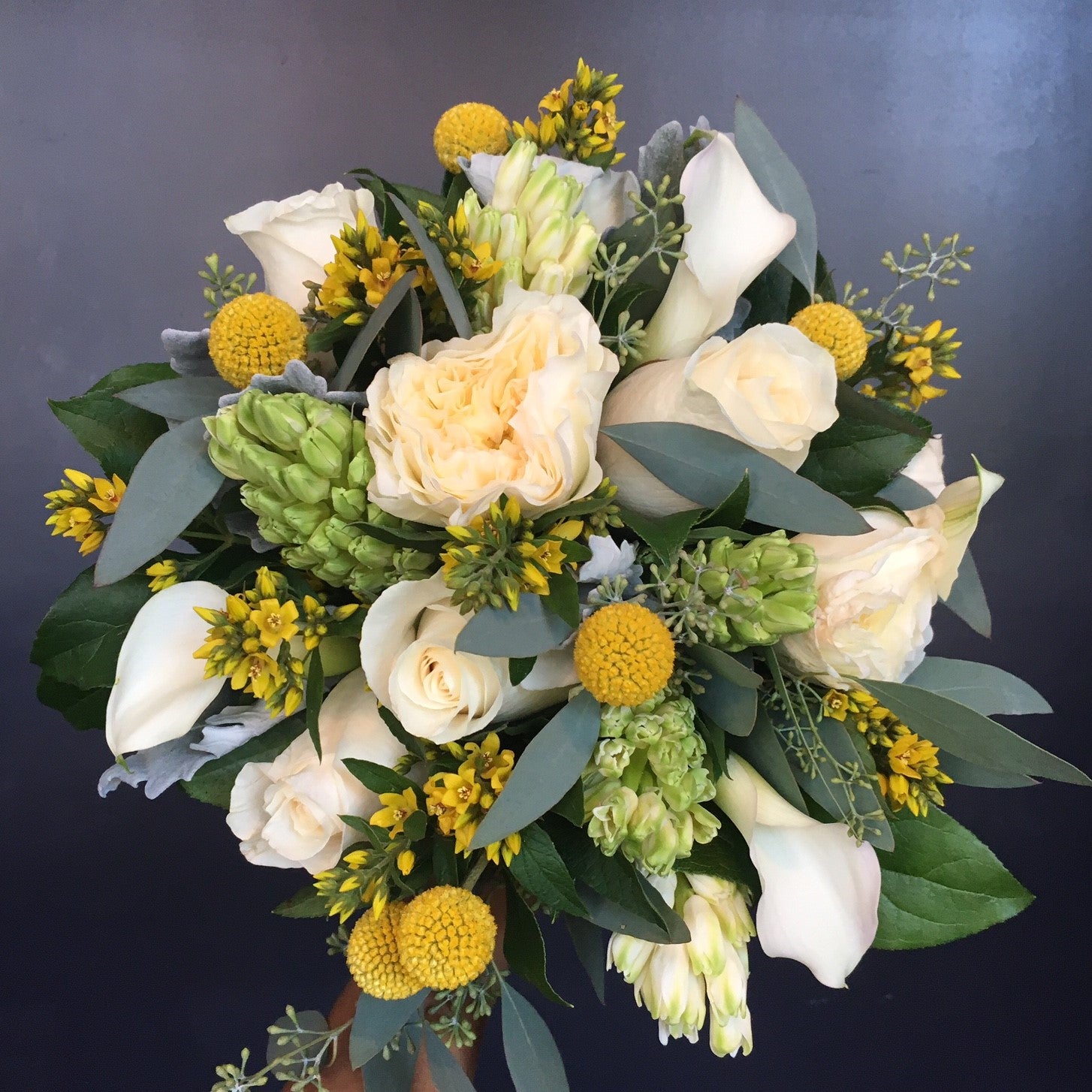 Yellow and Cream mix of flowers. Include Hyacinth, Billy Balls, Calla, Roses, Yellow Wild Flower, Eucalyptus, Lemon Leaf, and Peony. Could have a substitute for Peony depending on the season.