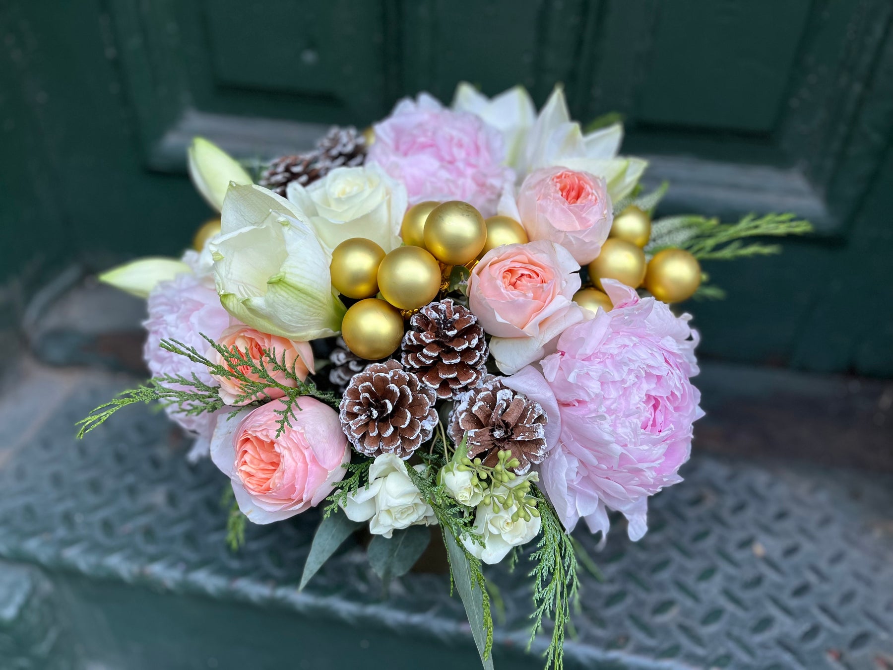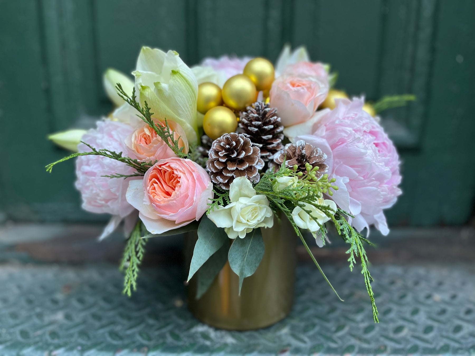 Celebrate the season with “A Blushy Christmas,” a festive and elegant holiday arrangement. Featuring soft blush garden roses, white spray roses, pink peonies, amaryllis, and lush seasonal greenery, this design captures the warmth and beauty of the holidays. Accented with frosted pinecones and golden ornaments, it brings a touch of sparkle and festive charm to any space.