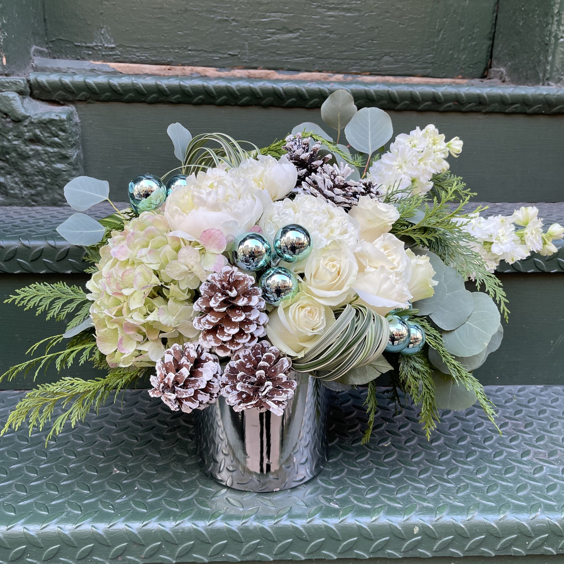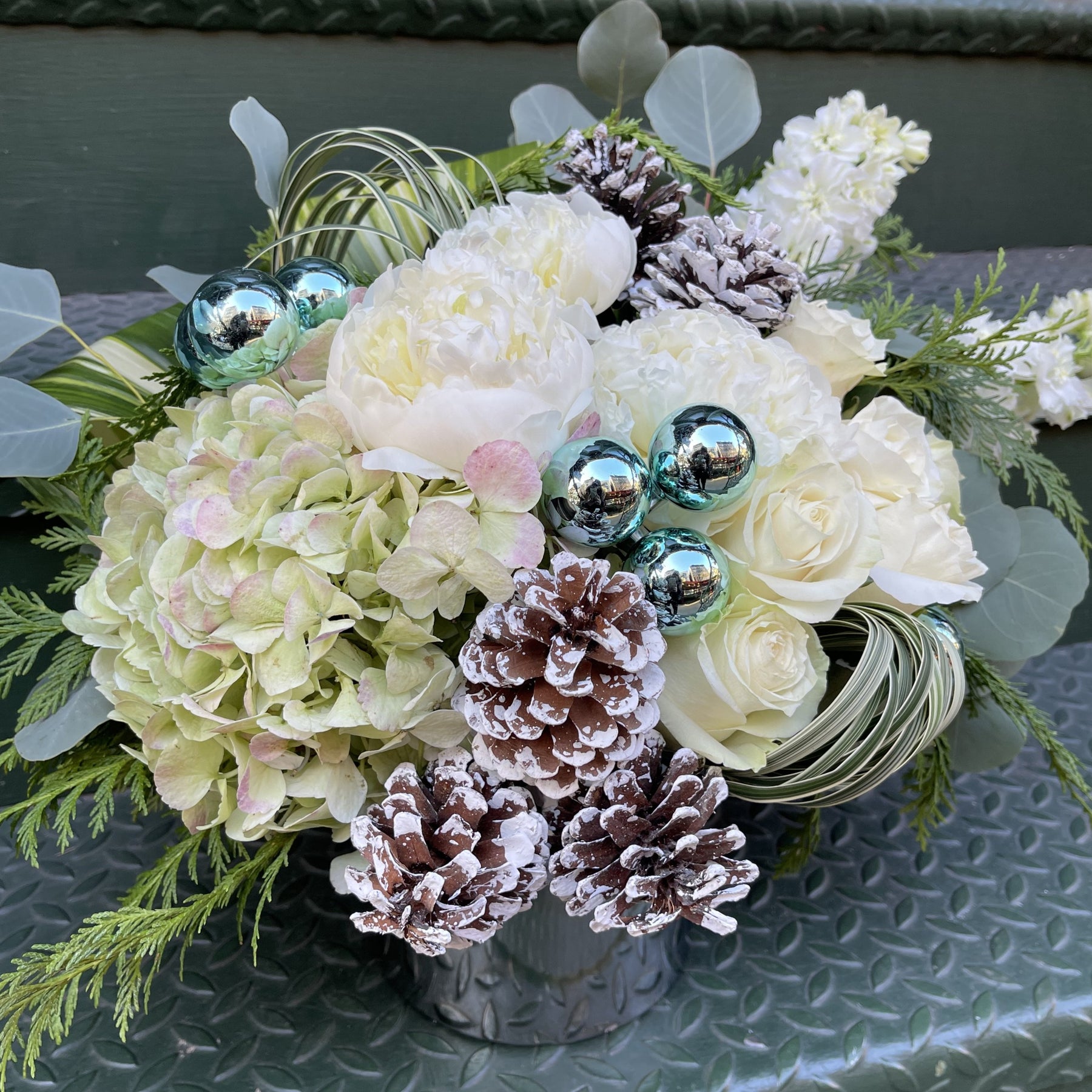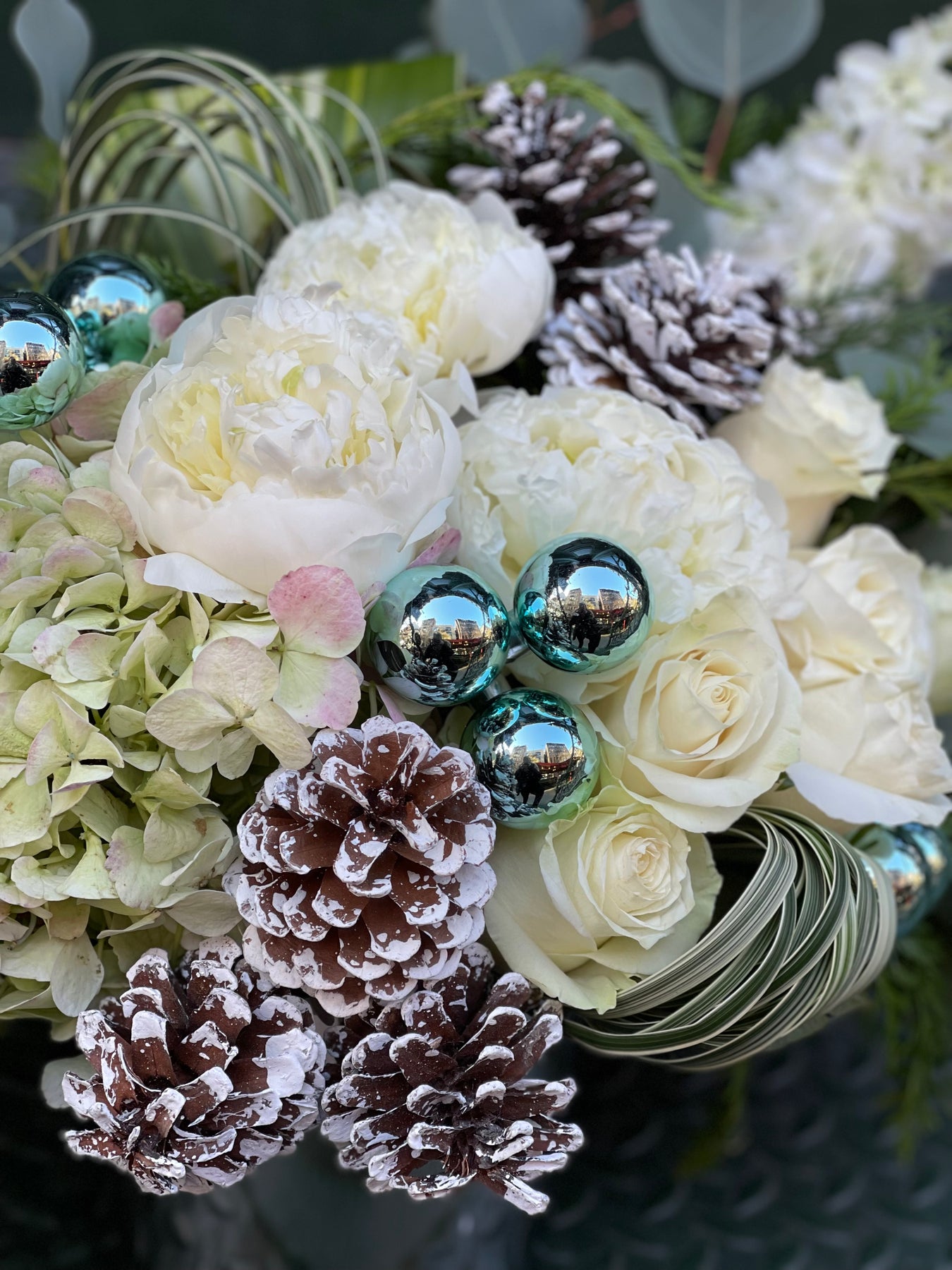 A lush design of white peony, hydrangea, blue ornaments, cypress greens, Snow Pine Cones, White Delphinium, White Rose, and mixed eucalyptus for a soft winter scent