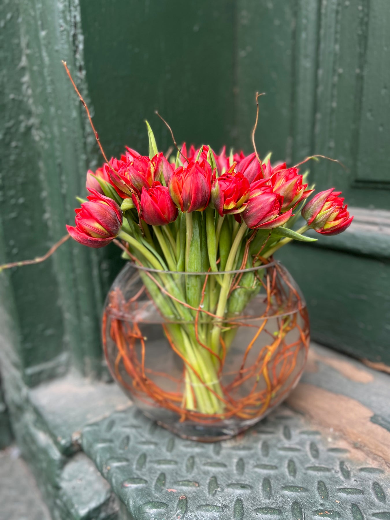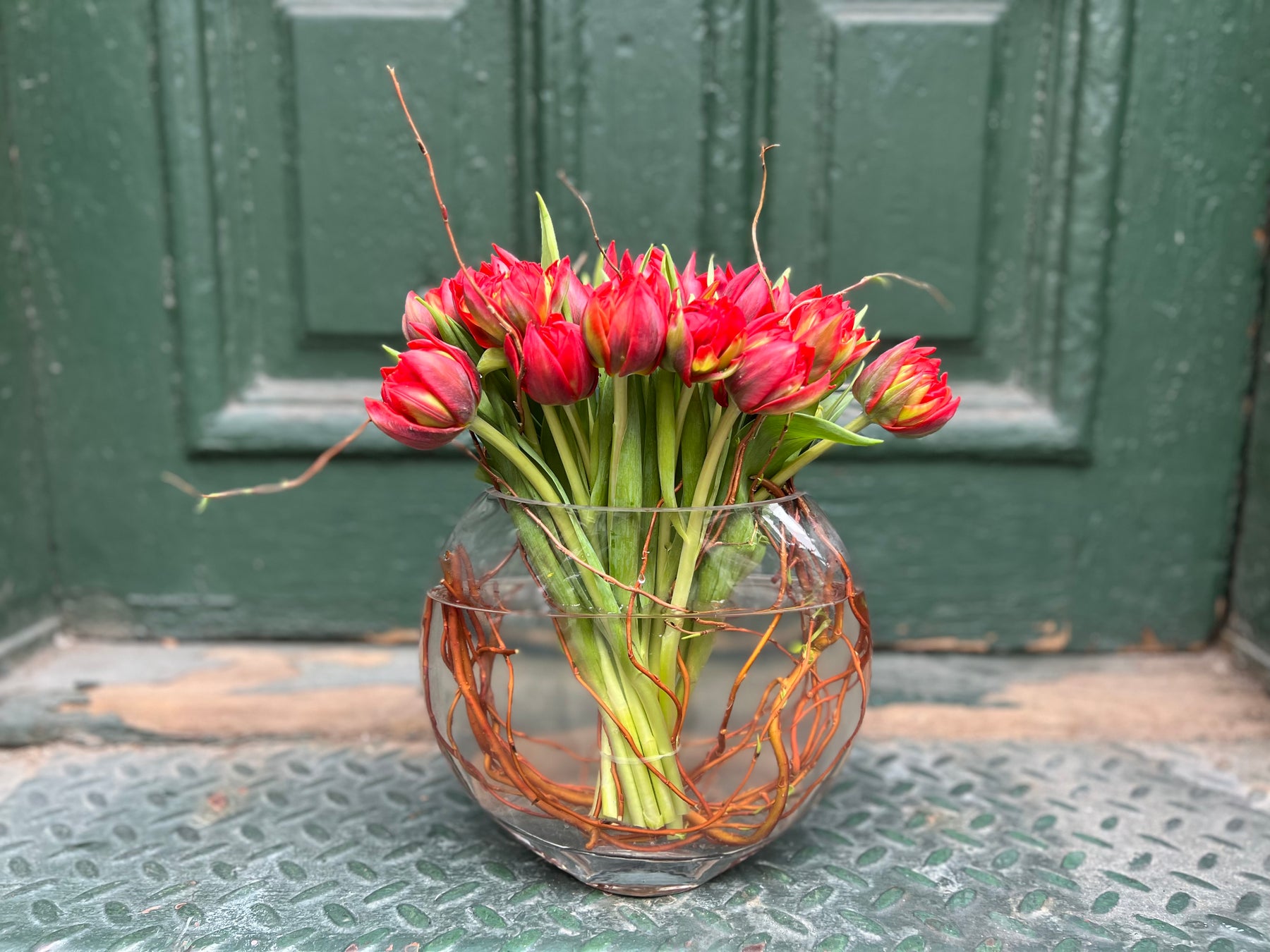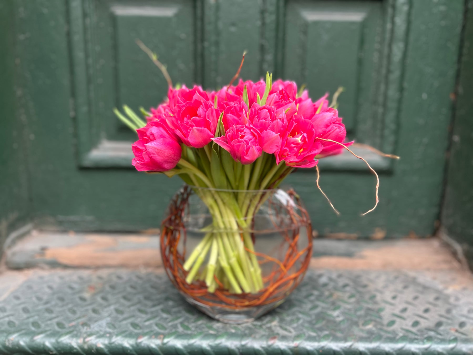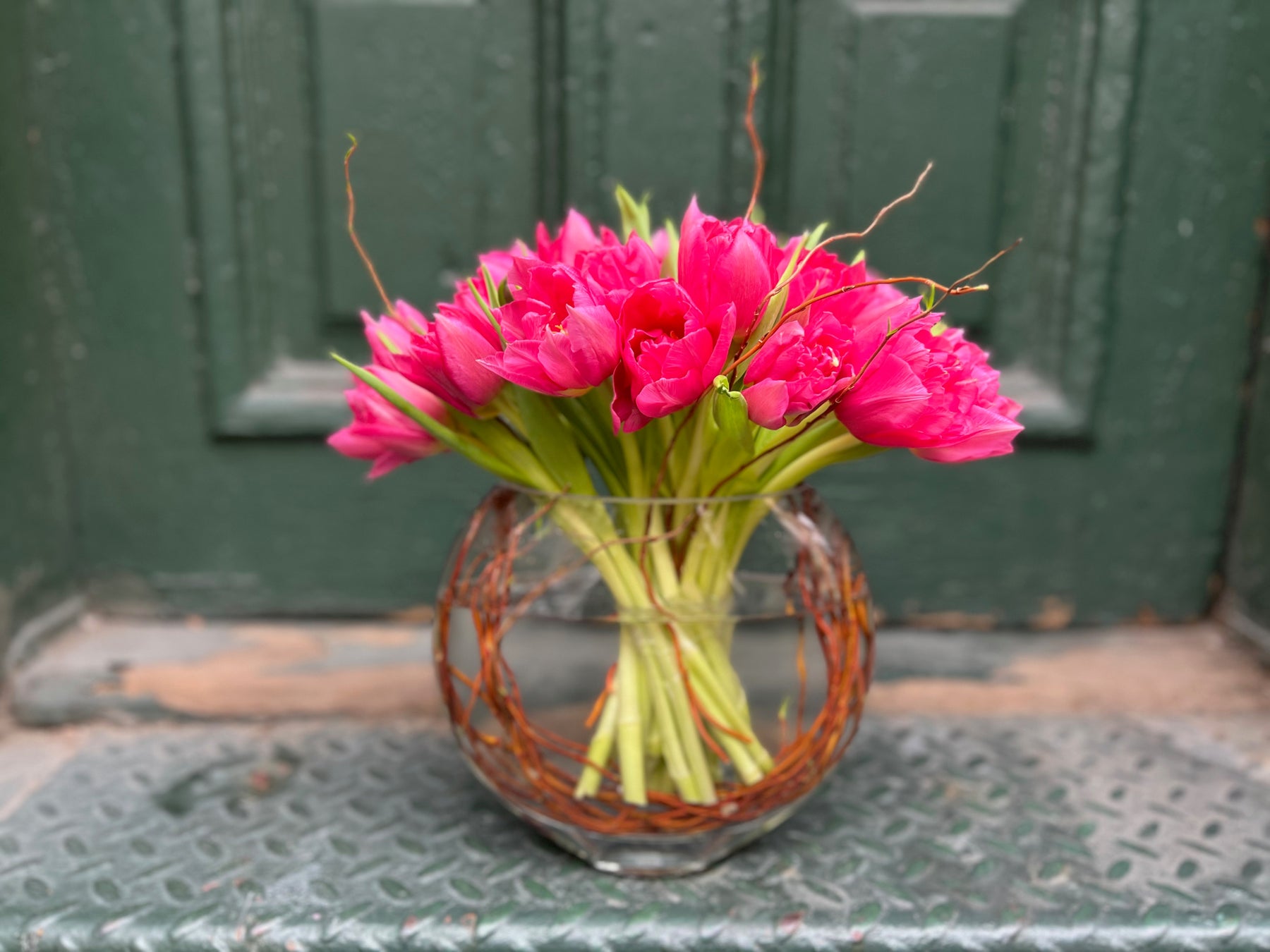 Tulips arranged in a modern oval vase with Curly Willow branch accents— balancing the vibrance of the tulips with the natural additions.