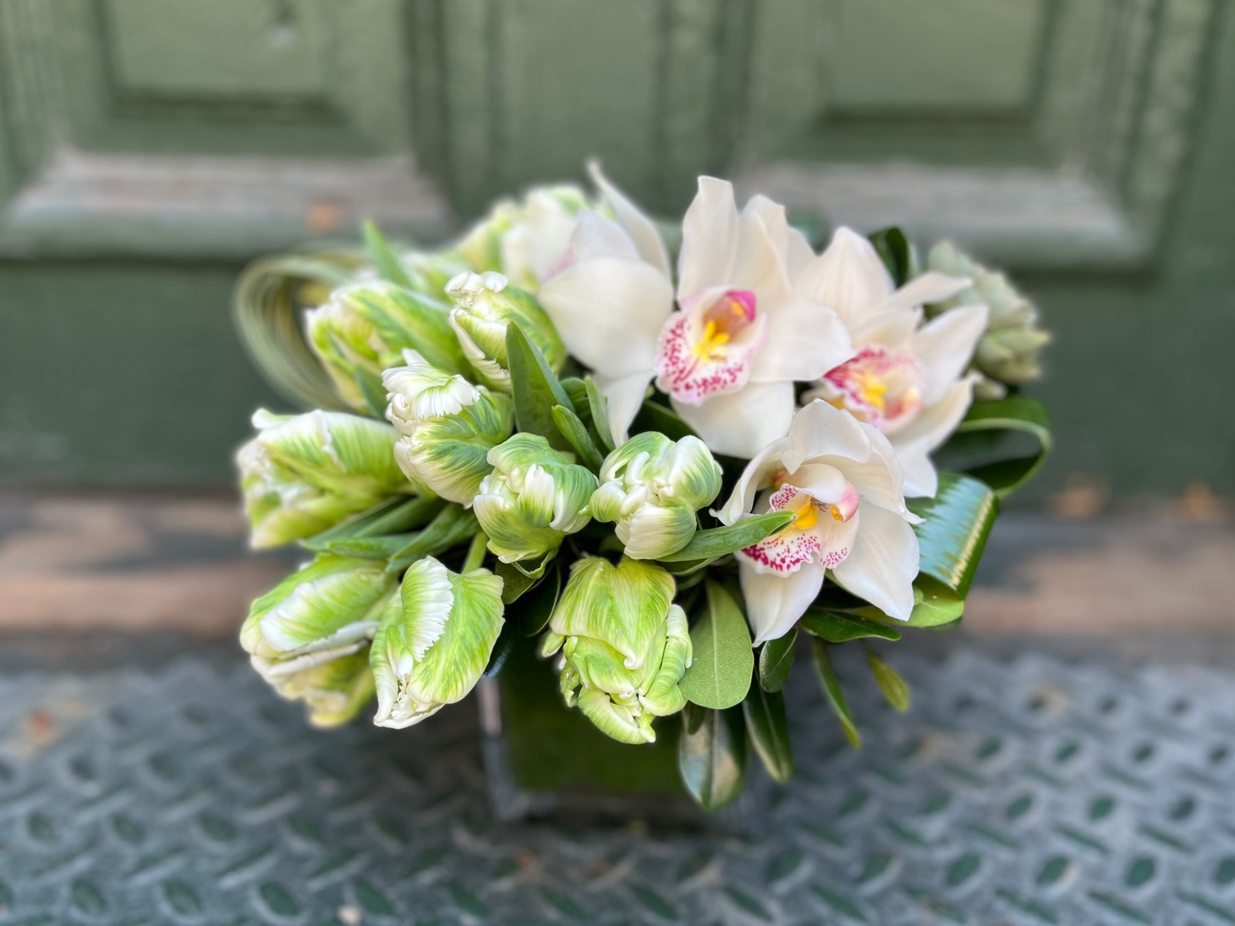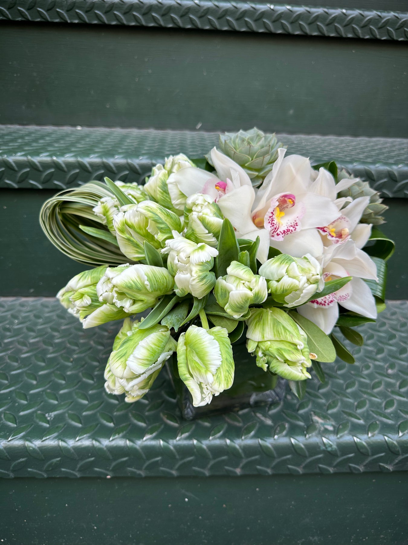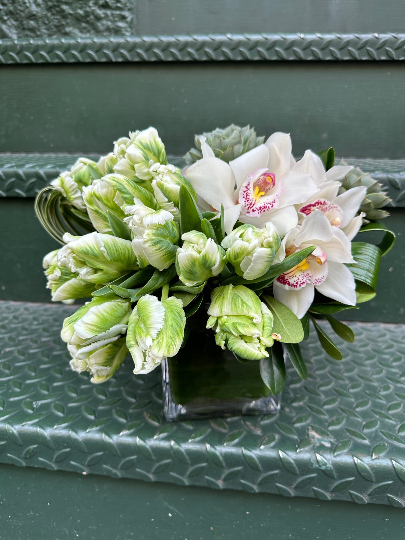 Lime Green Parrot Tulips, White Cymbidium, Green Succulent Accent, with Aspedistra leaf loops in a clear glass cube. With its clean blooms and green accents, it's no wonder this design is Miss Popular.