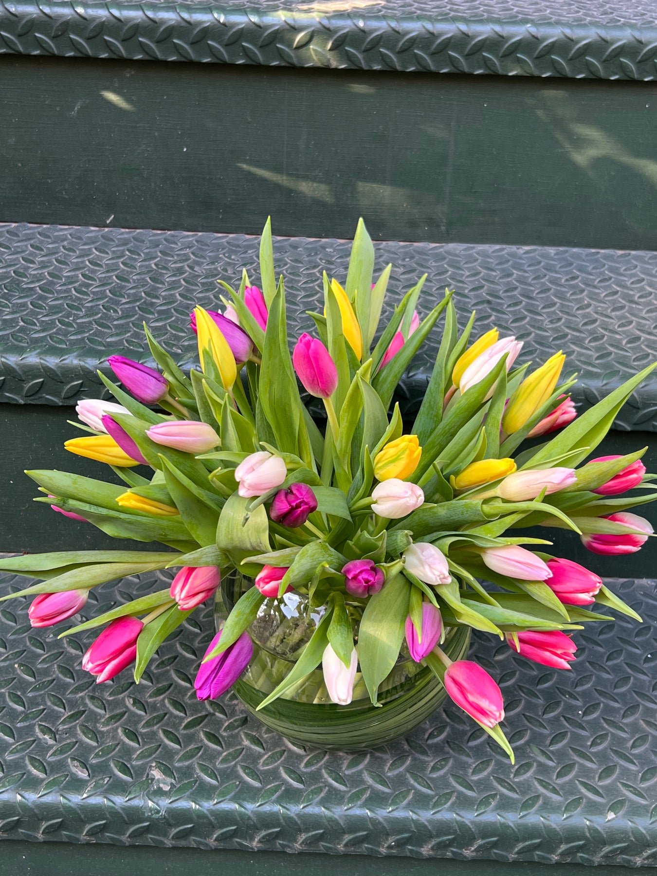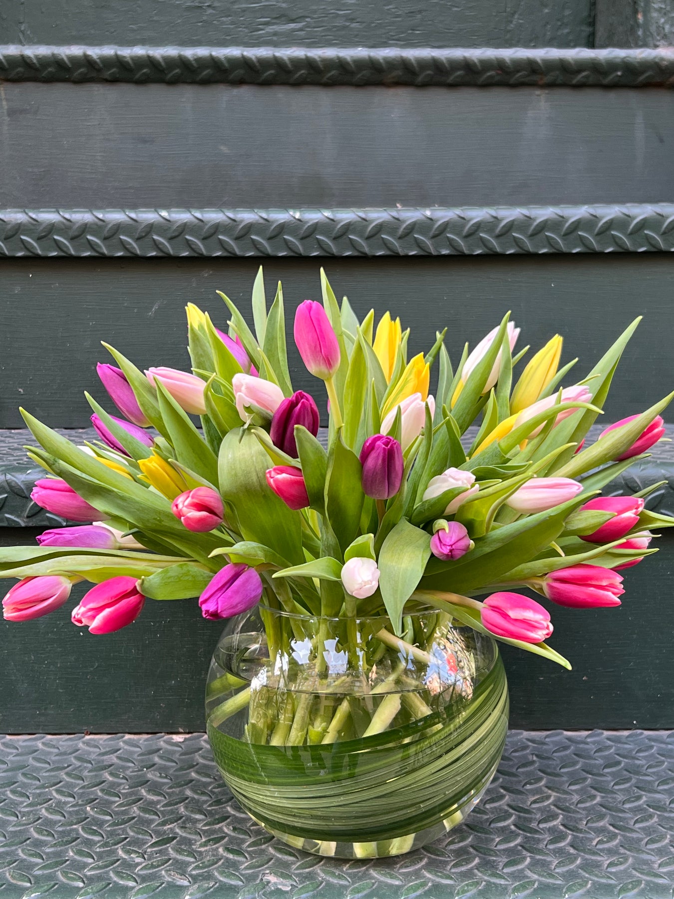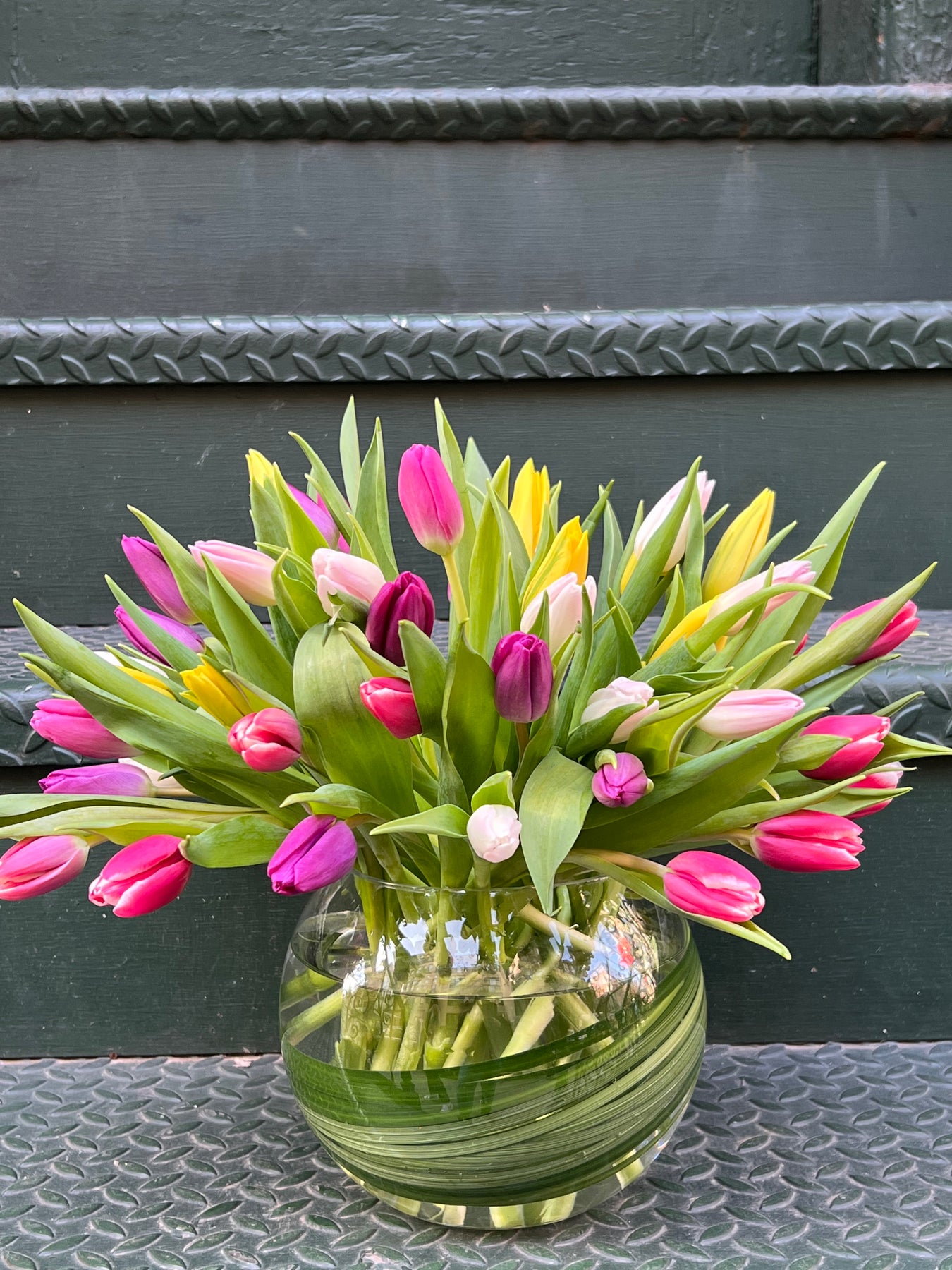 Tulip colors will vary depending on availability, but will always be a vibrant assortment of bright hues. Seasonal varieties may vary; similar blooms will be substituted to maintain the same overall look and feel.