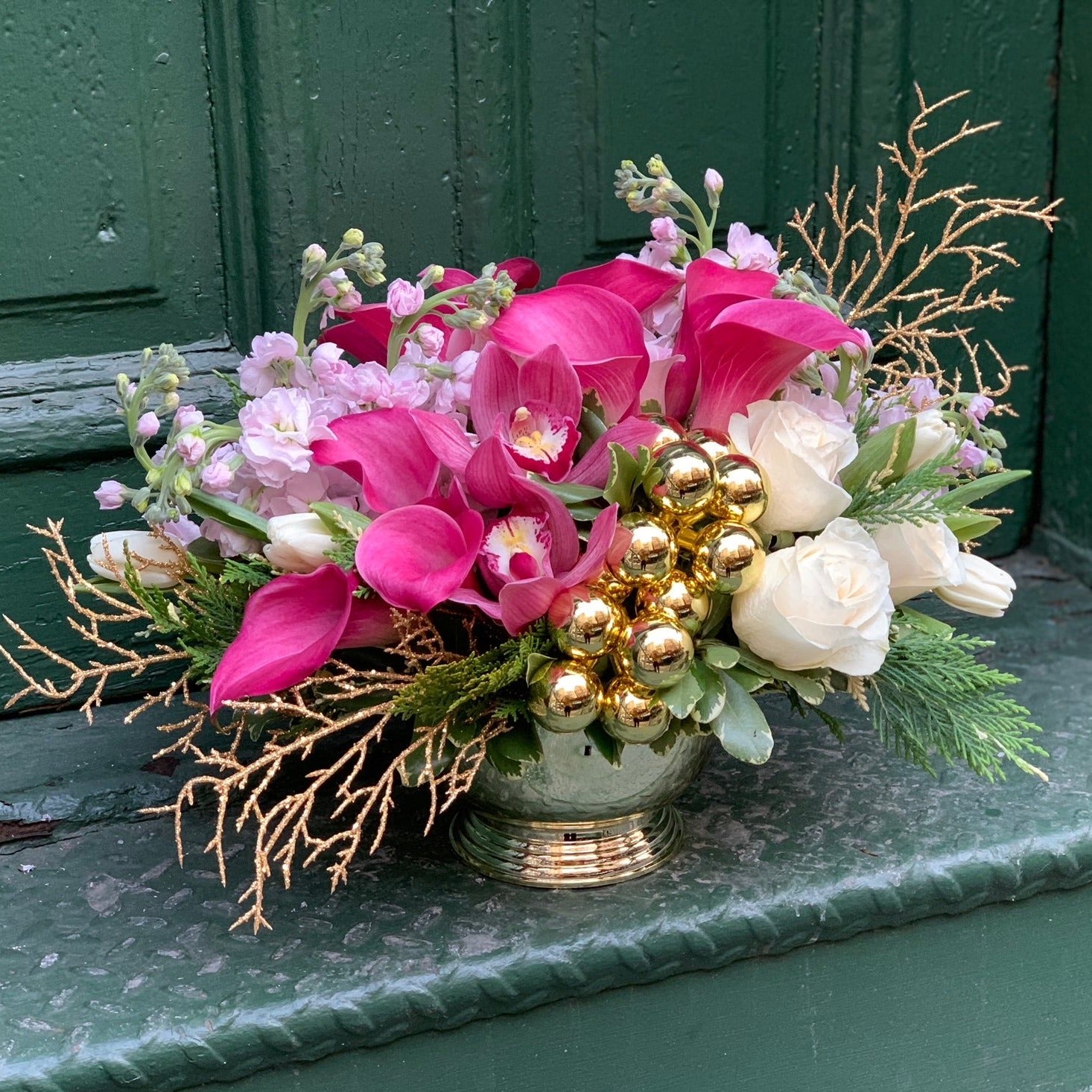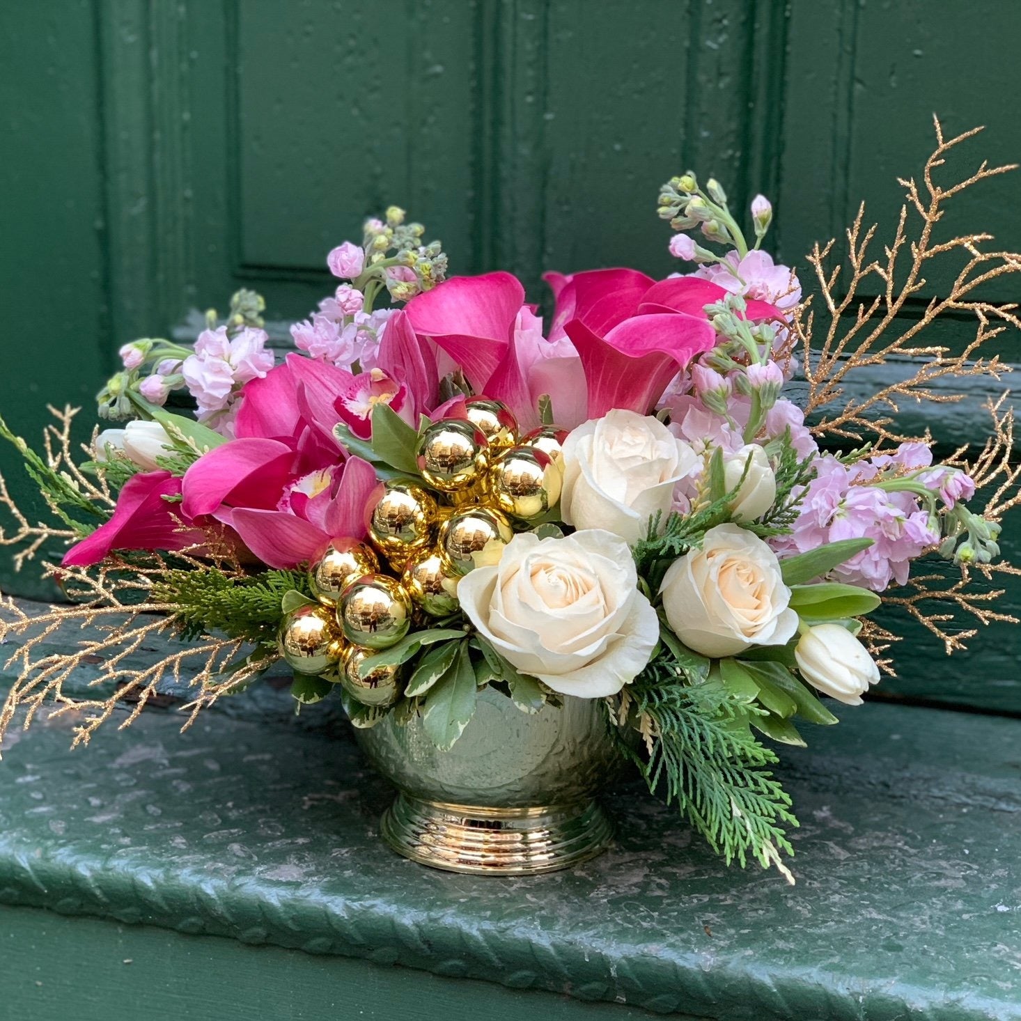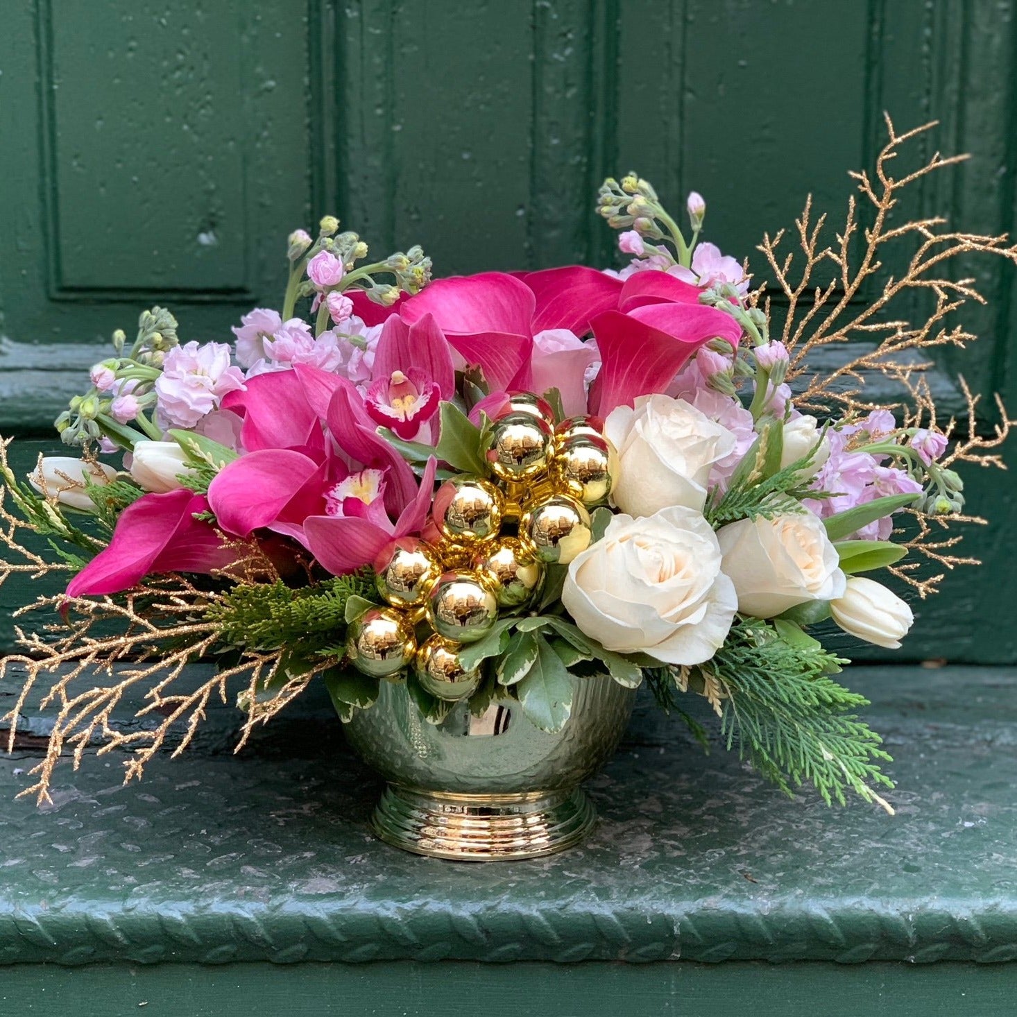A Pink Christmas it is! Enjoy a girly christmas with this gold and pink combo with golden ornaments and a festive gold vase. Flowers include calla lilly, hydrangea, roses